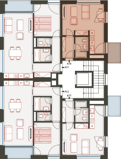 Architektura logické geometrie využívá ušlechtilé nadčasové materiály. Zvenčí je to primárně režné zdivo, které zajišťuje vizuální propojení všech tří bytových domů uzavřeného rezidenčního komplexu.