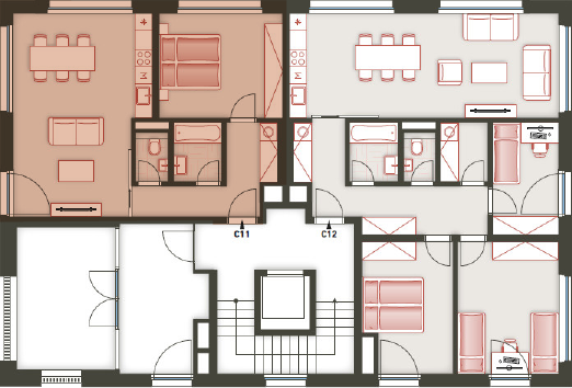 Architektura logické geometrie využívá ušlechtilé nadčasové materiály. Zvenčí je to primárně režné zdivo, které zajišťuje vizuální propojení všech tří bytových domů uzavřeného rezidenčního komplexu.