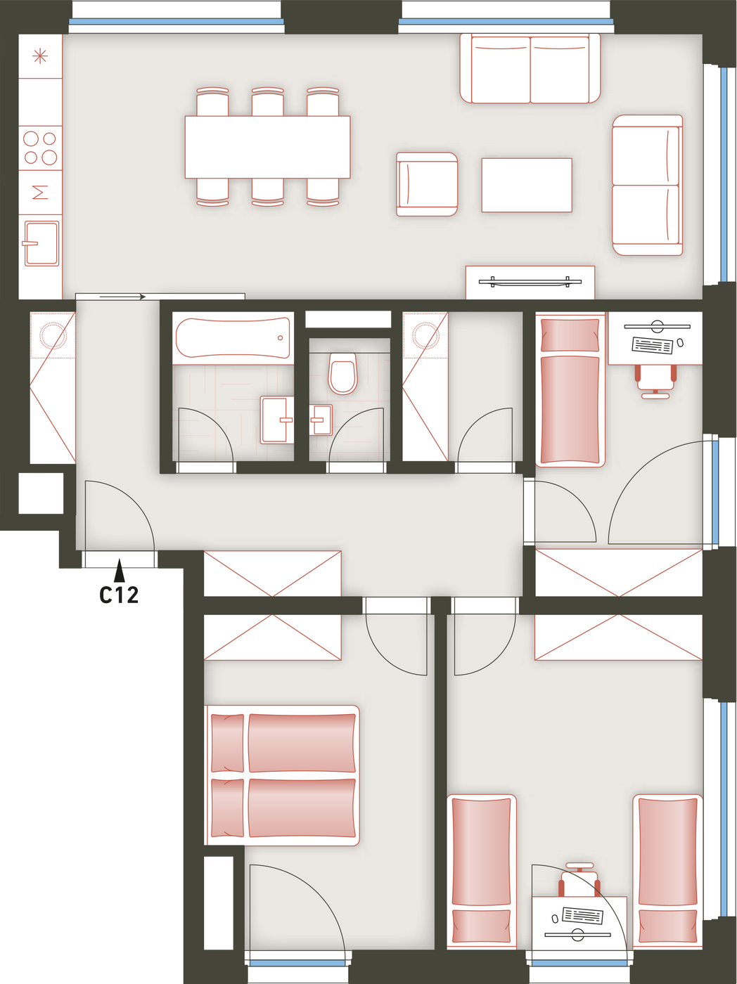 Architektura logické geometrie využívá ušlechtilé nadčasové materiály. Zvenčí je to primárně režné zdivo, které zajišťuje vizuální propojení všech tří bytových domů uzavřeného rezidenčního komplexu.