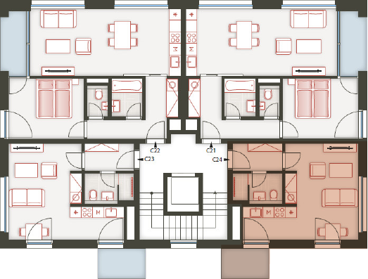 Architektura logické geometrie využívá ušlechtilé nadčasové materiály. Zvenčí je to primárně režné zdivo, které zajišťuje vizuální propojení všech tří bytových domů uzavřeného rezidenčního komplexu.
